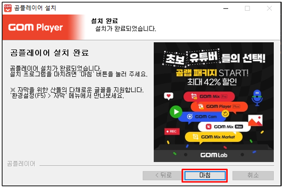 5. 모든 설치가 끝났고, [마침] 을 클릭하여 곰플레이어를 실행합니다.