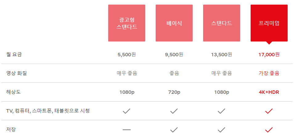 월 요금별 제공되는 서비스 종류가 있습니다. 광고형 스탠다드, 베이식, 스탠다드, 프리미엄이 있으니 마음에 드는 요금제로 보시기 바랍니다.