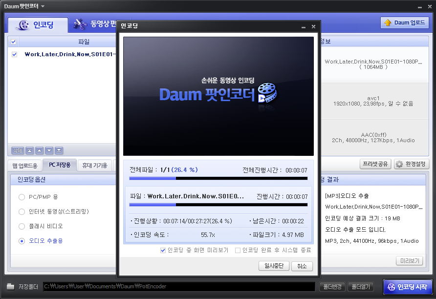 다음팟인코더는 동영상 형식 변환 및 합치기, 자르기 등 다양한 편집을 할 수 있는 프로그램입니다. 그리고 동영상에서 음원만 추출할 수 있는 기능도 있습니다. 아래와 같이 따라 하시면 금방 음원 추출 가능합니다.