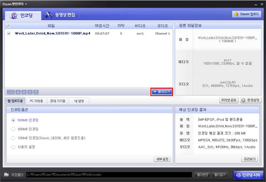 1. 팟인코더를 실행한 후 [불러오기] 를 클릭하여 음원 추출할 동영상을 선택합니다.
