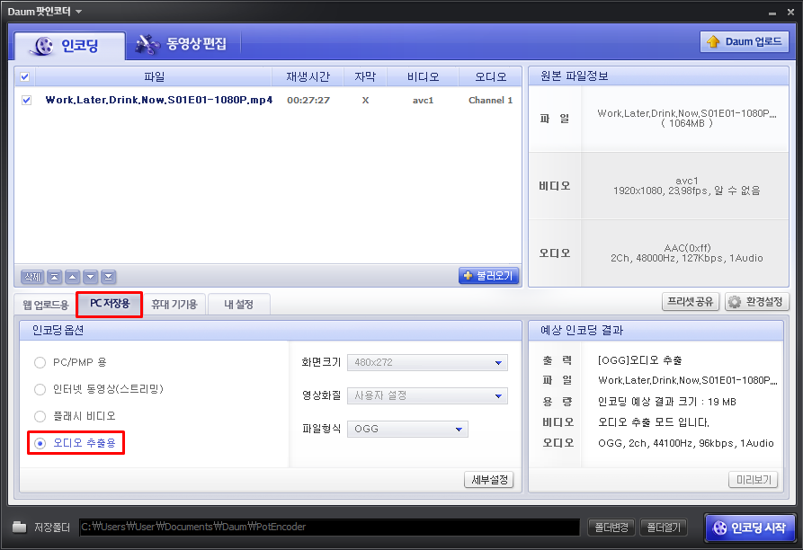 2. 그리고 [PC저장용] 탭을 선택하고 오디오 추출용 옵션을 선택합니다.