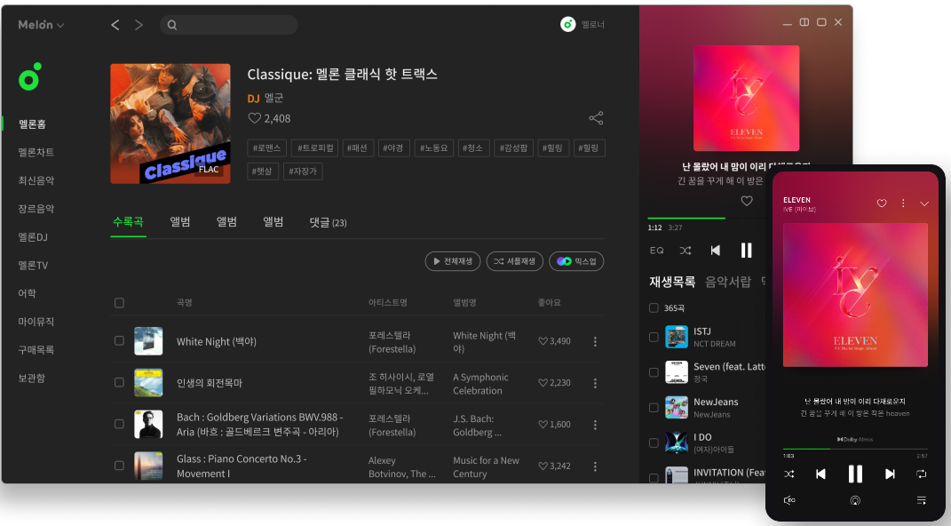 음악 다운로드 시 고음질을 선택할 수 있습니다.