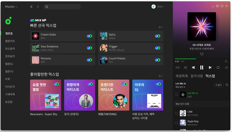 메인 인터페이스, 최신 음악, 실시간 차트, 장르 등을 한 눈에 제공합니다.