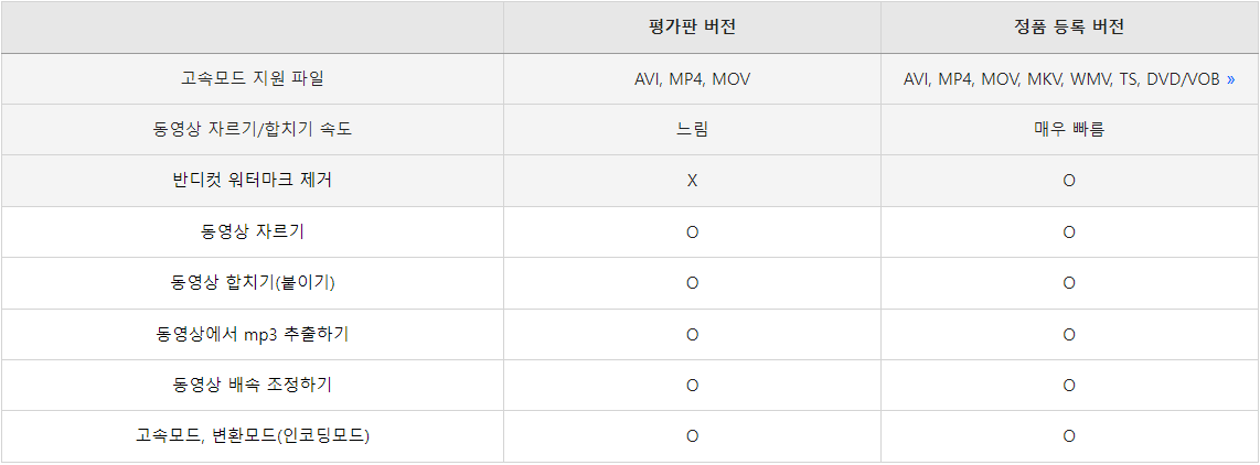 주요 기능 | • 고속모드 지원파일 • 동영상 자르기/합치기 속도 • 워터마크 제거 • 동영상 mp3 추출기능 • 동영상 배속 조정기능 |
