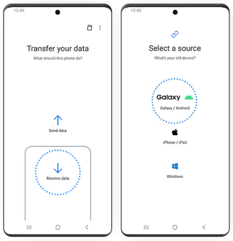 새로운 갤럭시 기기에서 스마트 스위치 앱을 엽니다. 데이터 받기를 누른 다음 갤럭시를 선택합니다.