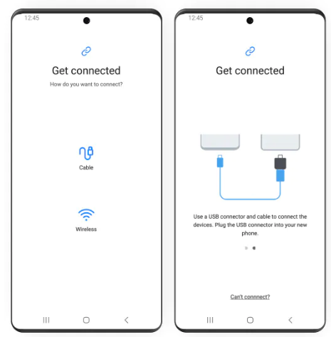 무선 연결을 선택하거나 USB케이블을 사용하여 이전 기기를 새 갤럭시 기기에 연결합니다.