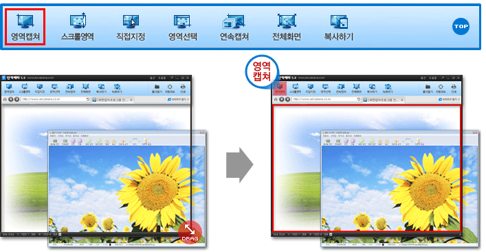 안카메라 캡쳐창이 내려가며 직접지정(드래그방식) 캡쳐 모드로 전환하여 캡쳐합니다.