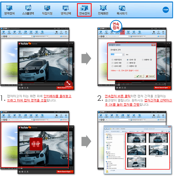 화면 위에 안카메라를 올려놓고 드래그하여 캡쳐 영역을 조절하고 연속캡쳐 버튼을 클릭하여 캡쳐 간격 조절 옵션창을 선택하여 캡쳐한다.