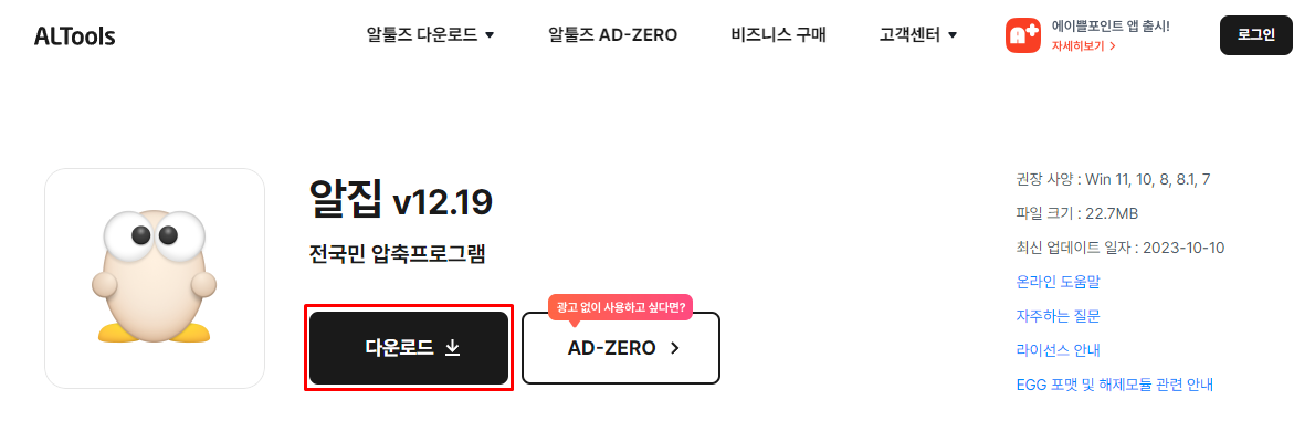 알집 프로그램은 무료이면서도 압축해제 속도도 월등히 빠릅니다. 알집을 다운받으려면 알툴즈 공식홈페이지에 가셔서 다운받으시면 되지만, 아래 링크로 바로 다운로드 받을 수 있습니다.