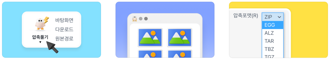 - 한번의 클릭으로 바탕화면, 다운로드, 압축파일 원본 경로에 압축 풀기가 가능합니다.