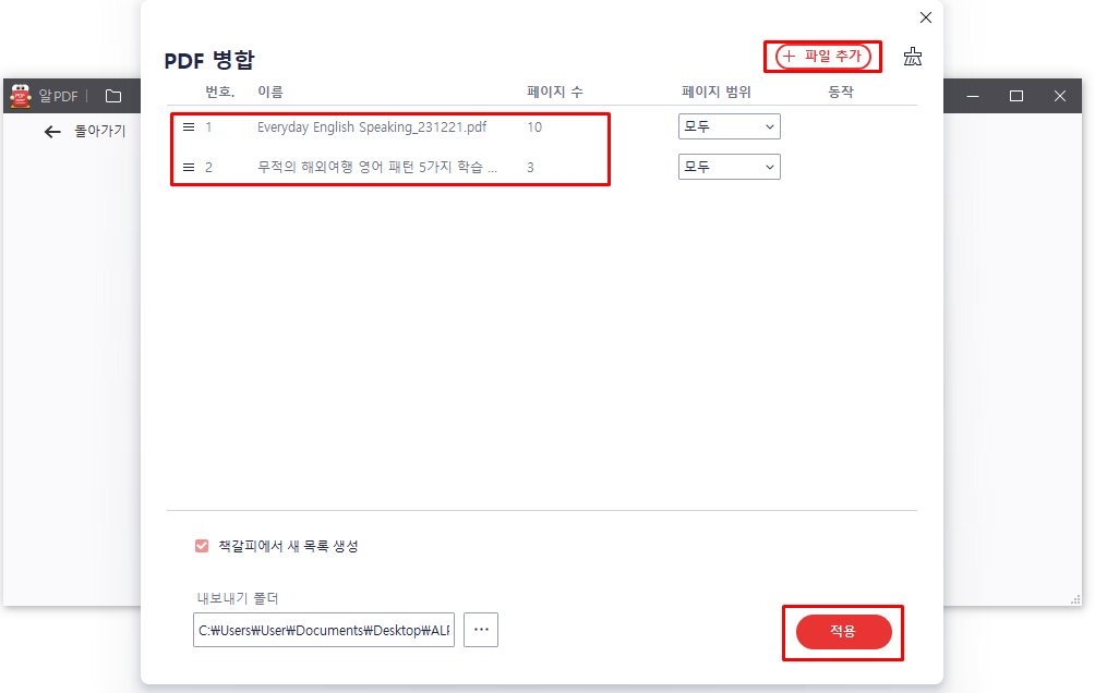 3. 2개 이상의 PDF파일을 [파일추가] 버튼을 클릭하여 불러올 수 있습니다. 합칠 파일을 다 불렀으면 [적용] 버튼을 눌러 파일을 병합합니다. 그리고 저장할 폴더위치는 [내보내기 폴더]에서 위치를 정할 수 있습니다.