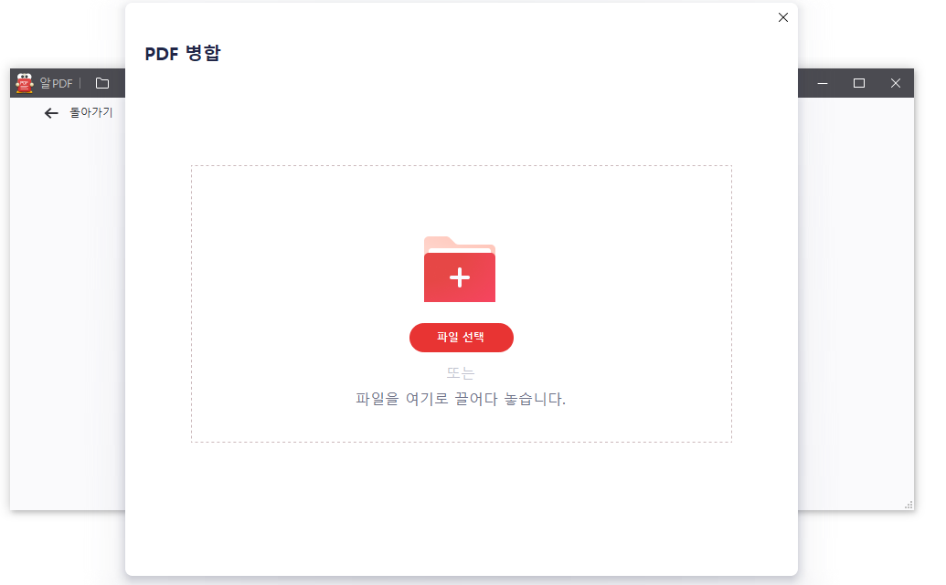 2. PDF병합 팝업창이 뜨고 병합할 PDF파일을 [파일선택] 을 클릭하여 불러오거나 바로 파일을 드래그해서 넣으면 됩니다.