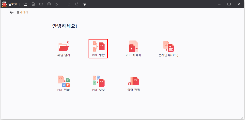 1. 알PDF 프로그램 실행시킨 후, [PDF병합] 메뉴를 클릭합니다.