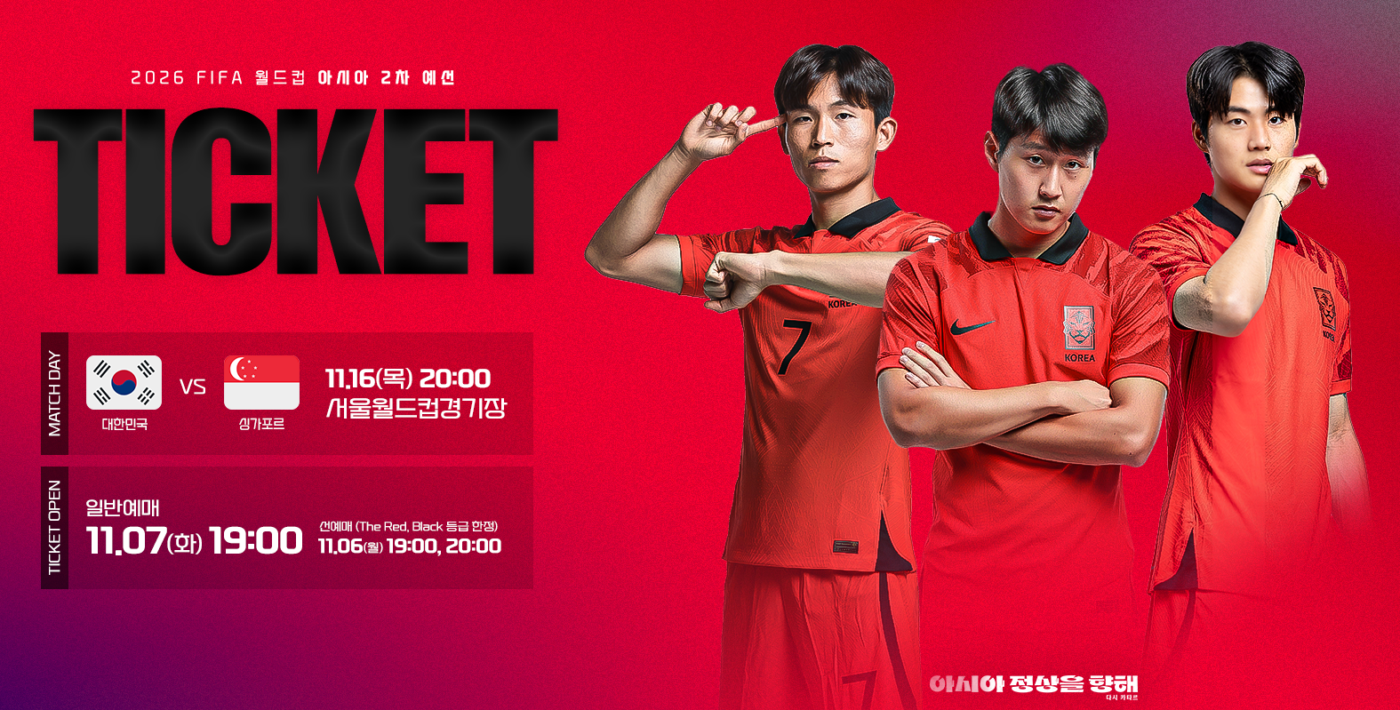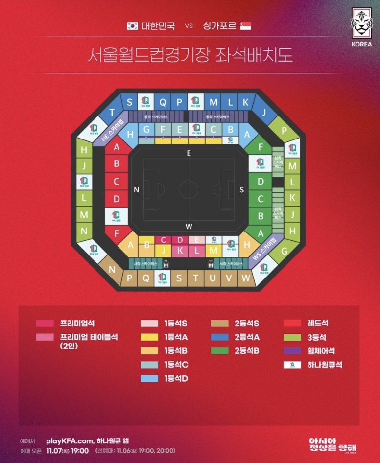 아시아 지역 예선 1차전은 싱가포르와 2023년 11월 16일(목) 오후 8시에 서울월드컵 경기장에서 치뤄집니다. 사전 예매는 11월 6일에 완료되었으며, 일반 예매 오픈은 11월 7일(화) 오후 7시부터 시작하니 아래 링크로 빠른 예매하시기 바랍니다.