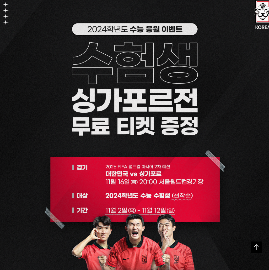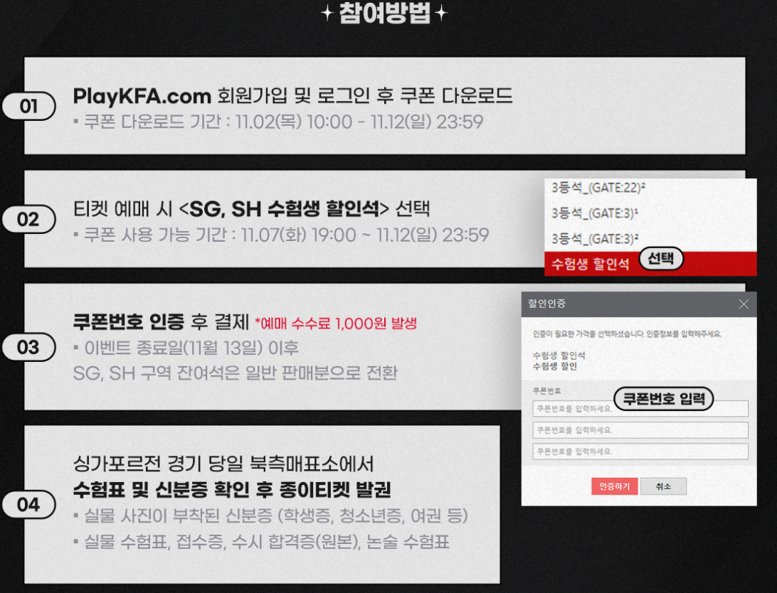 2024학년도 수능 응원 이벤트로 수험생들에게 싱가포르전 무료 티켓이 제공되니 참고바랍니다. 관람 구역은 SG, SH석(수험생 할인석) 이며, 꼭 관람시 수험표 및 신분증이 필요합니다. (예매 수수료 1,000원 발생)