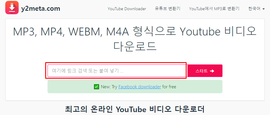 Step1 y2meta.com 홈페이지에 접속하여 아래 이미지처럼 입력창에 다운받고자 하는 유튜브 영상 URL을 복사해서 넣습니다.