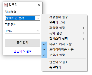 | 핵심 기능 | 칼무리는 알캡처, 픽픽과 함께 많이 사용되는 화면 캡처 프로그램입니다. 추가적인 기능은 동영상 녹화지원, 웹페이지 전체 캡처, 색상추출기능, 단축키 설정, 프린터 출력 등 다양한 기능을 사용할 수 있습니다. |