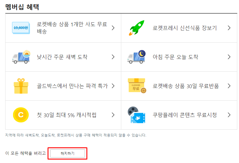 4. 와우 멤버십 페이지에서 아래의 [해지하기] 버튼을 클릭하면 와우 멤버십이 해지되면서 쿠팡플레이도 자동적으로 해지가 됩니다.