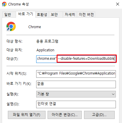 3. 속성 팝업창에서 [대상] 입력창에서 아래 옵션을 추가한 후 [확인] 버튼을 클릭합니다.