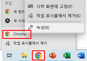 2. 아래 이미지처럼 크롬 아이콘에서 마우스 우클릭하면 [속성]이 표시되고, 속성을 선택합니다.