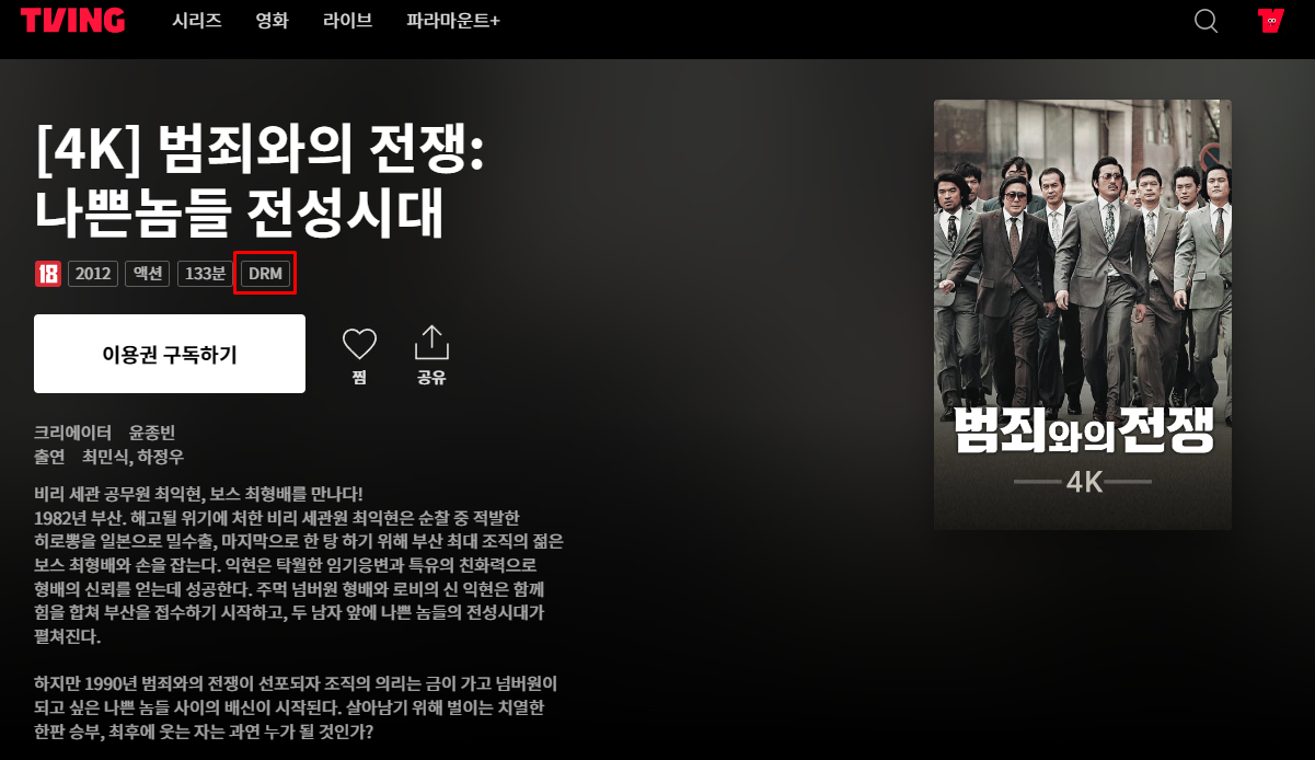 - 아래 영화처럼 DRM이 표기되어 있는 영화는 다운로드 받을 수 있습니다. DRM은 디지털컨텐츠저작권보호를 의미하며, DRM표기가 되어 있는 영화만 다운로드 가능합니다. 그리고 영상 다운로드시 구독요금제에서 추가 구매가 필요한 점 참고바랍니다.