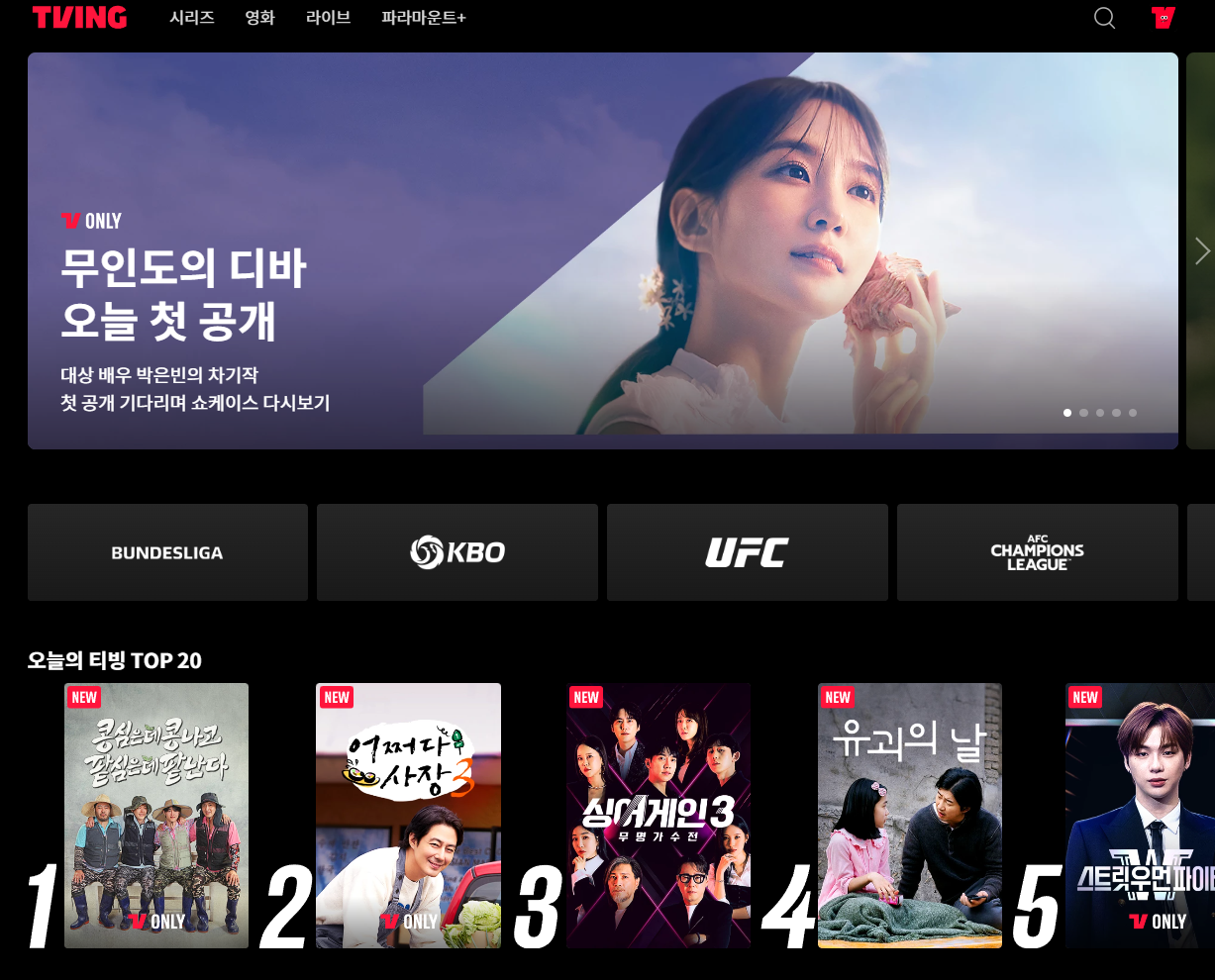 티빙 홈페이지에서 다양한 컨텐츠(영화, 드라마, 예능 등)을 시청할 수 있습니다. 그리고 오프라인으로 다운로드하면 인터넷이 안되는 곳에서도 영화 등을 시청할 수 있습니다.