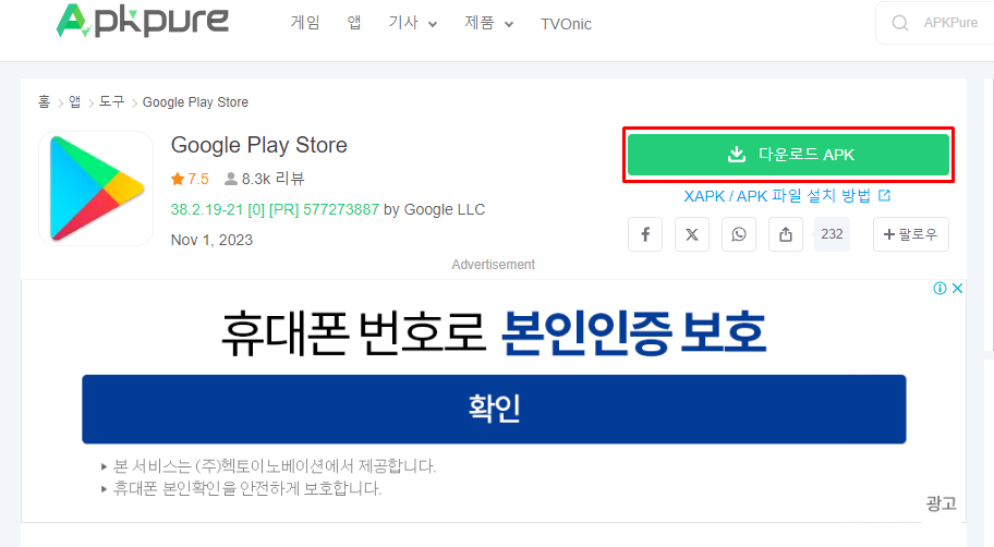 Apkpure 사이트에서 다운로드