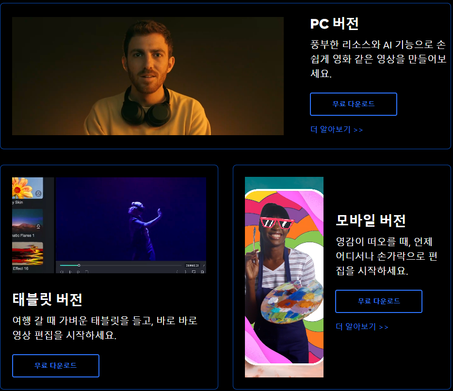 주요 기능 | • AI 도구로 더 스마트하고 간편하게 편집 • 복합한 편집기술 필요없이 영상주세 맞게 활용 • 더 많아진 리소스(에셋 라이브러리) • 크로스 플랫폼 지원 • 언론매체 평가 & 어워드 |