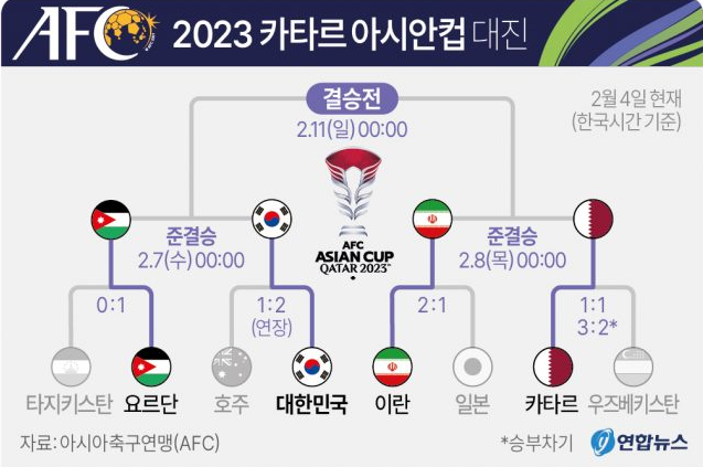 이제는 준결승만 승리하면 64년만에 아시아 정상에 도전할 수 있게 되었습니다. 일본은 8강전에서 이란에게 2:1로 패배를 해서 한국과의 경기는 할 수 없게 되었습니다. 만약 요르단을 준결승에서 승리하면 이란과 카타르의 승리한 팀이 결승전에서 경기할 수 있습니다.