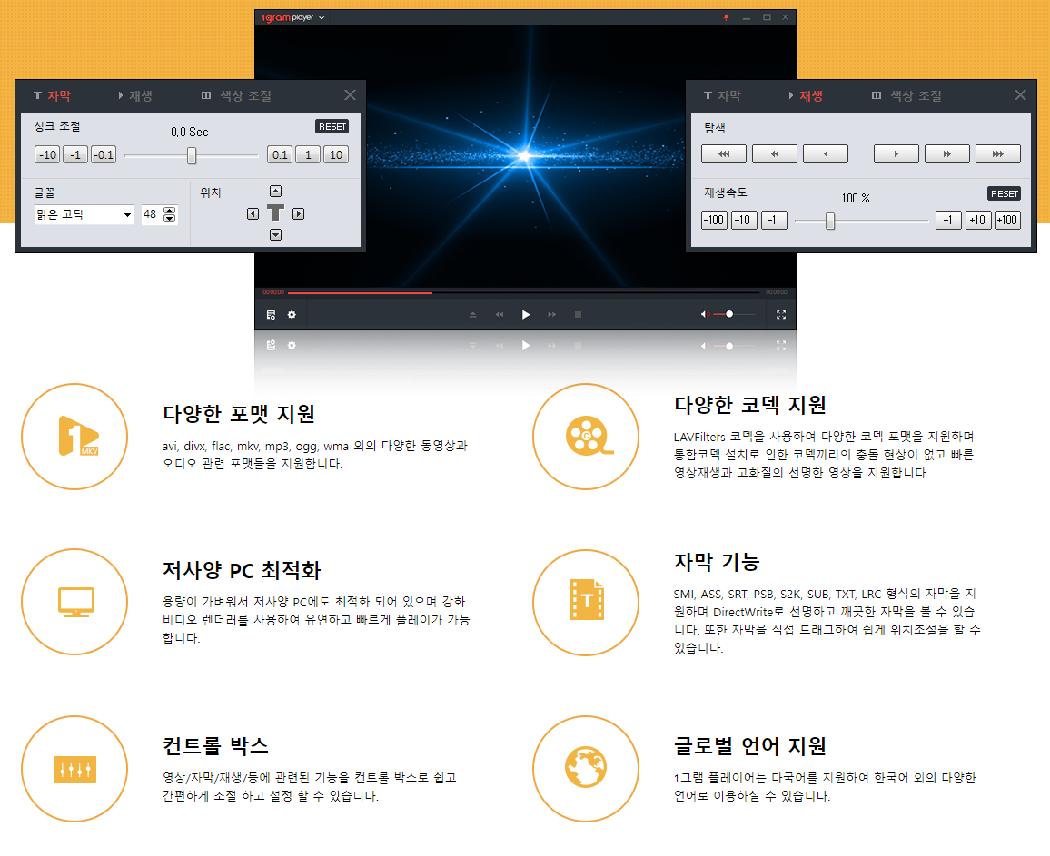 | 핵심 기능 | 1그램 플레이어는 최신 통합코덱을 사용하여 대부분의 영상을 플레이할 수 있는 가볍고 빠른 무료 동영상 플레이어입니다. 프로그램이 가벼우며, 대용량 HD고화질 영상도 완벽하게 구현합니다. |