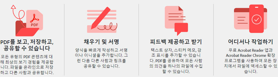 | 핵심 기능 | 어도비 아크로뱃 리더(Adobe Acrobat Reader) 는 어도비에서 개발한 전 세계에서 많이 사용하는 PDF 뷰어 및 편집 프로그램입니다. 기본적으로 PDF파일 열람 및 공유, 주석 또는 전자서명을 추가하는 기능을 제공하고 있습니다. |