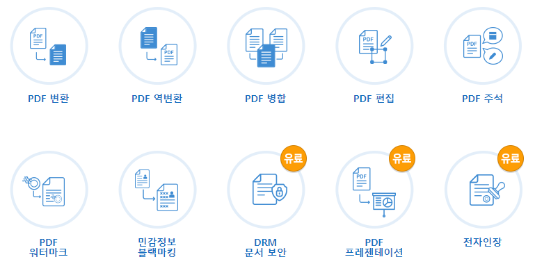 | 주요 기능 | • PDF 뷰어 및 편집 기능 • PDF 변환 및 병합 기능 • 문서의 보안 및 개인정보 보호기능 • 블랙마킹을 통한 문서 보안유지 기능 • 한글 문서 및 텍스트 파일, HTML, 이미지 파일 변환 |