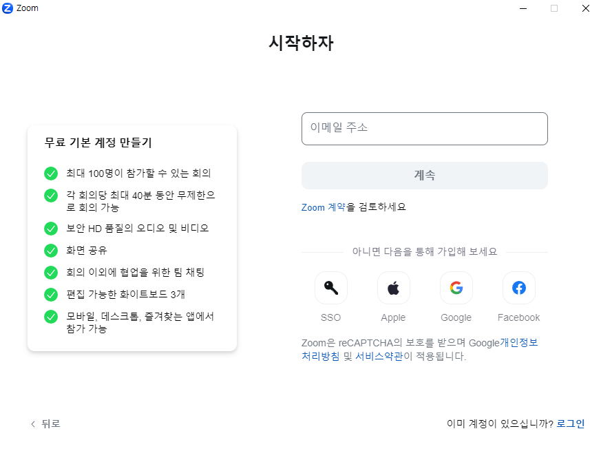 기본 무료이지만, 최대 40분의 접속시간 제한이 있습니다. 만약 회의가 많다면 유료버전으로 제약없이 사용해보시는 것도 있으니 참고바랍니다.