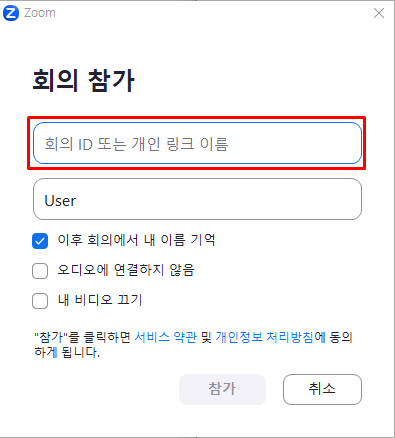 3. 회의 참가를 위해서는 회의 ID 또는 링크를 입력해야 합니다. 해당 회의 ID나 링크를 입력한 후 [참가] 버튼을 클릭하여 회의에 참가할 수 있습니다.