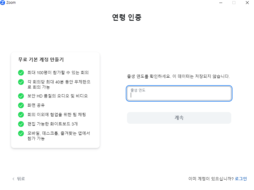 4. 회의를 주최하려면 회원가입이 필요합니다. [가입] 버튼을 클릭하면 아래 연령 인증에서 출생연도를 입력하시면 됩니다.
